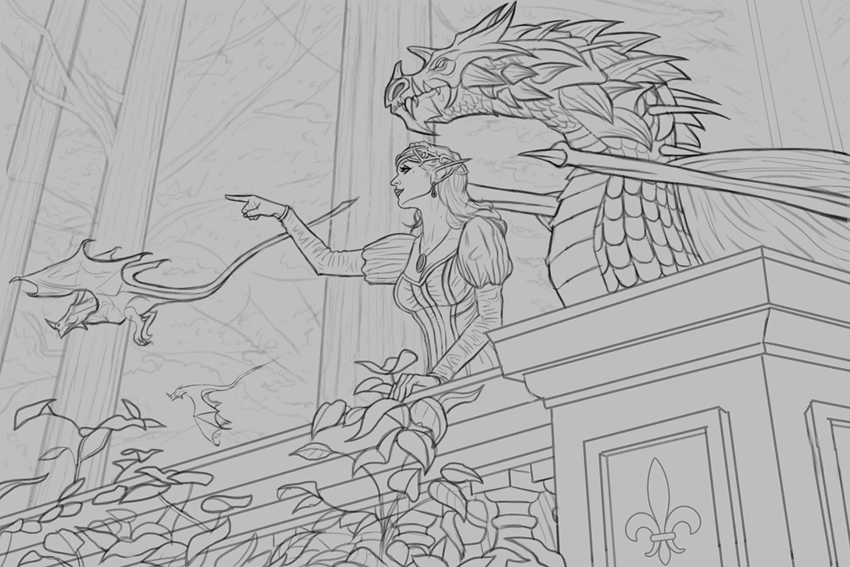 Personal fantasy illustration featuring a Queen and her friendly dragon in a castle. Please enjoy!